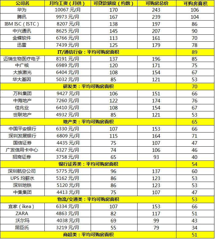 小編是這樣設(shè)想的,假設(shè)年終獎(jiǎng)以及其他收入用來生活及養(yǎng)家,月均工資用來供房,按首付三成,貸款三十年,算出了可貸款額度。之后,再除以0.7得出能購房的總價(jià),最后再除以2014年深圳新房均價(jià)(2.3萬元/平),計(jì)算出了能買多大面積的房子。